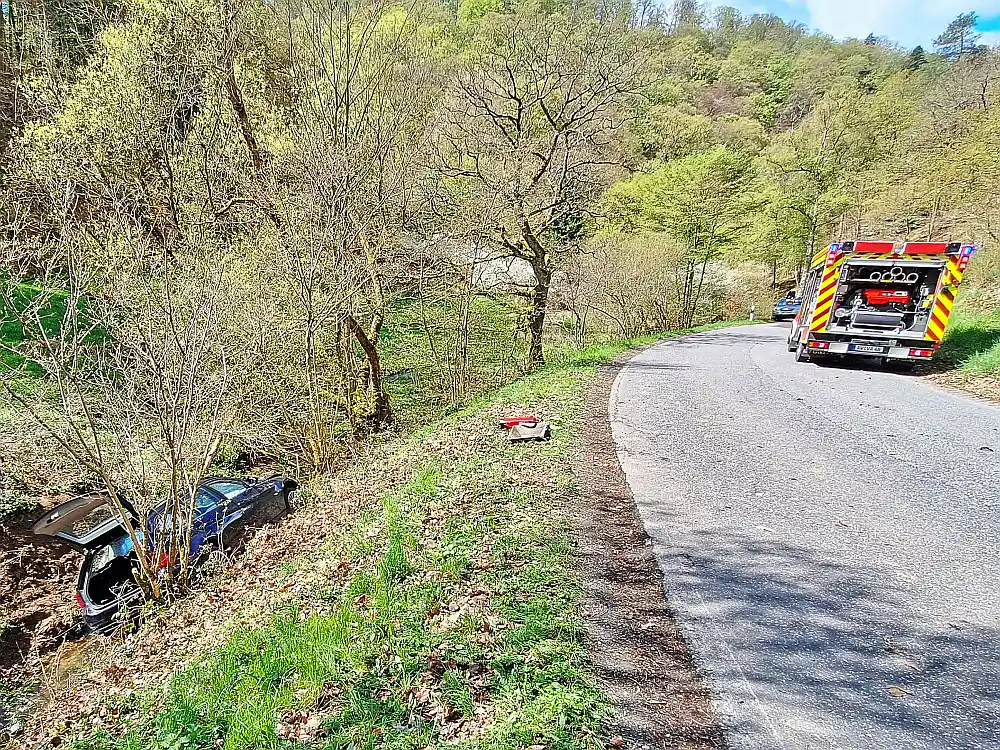 Am Sonntag, 19. April 2026, folgte um 12:09 Uhr ein weiterer Einsatz auf der K56 zwischen den Heckenbacher Ortsteilen Watzel und Cassel. Ein Pkw war aus ungeklärter Ursache von der Fahrbahn abgekommen, mit dem Dach gegen die Bachböschung geprallt und im Bachbett liegen geblieben. Auch hier wurde zunächst eine eingeklemmte Person gemeldet, was sich für die ersteintreffenden Kräfte jedoch nicht bestätigte. Der Fahrer konnte sich selbst aus dem Fahrzeug befreien. Die verletzte Beifahrerin verblieb bis zum Eintreffen des Rettungsdienstes im Fahrzeug und wurde dort von Kräften der Freiwilligen Feuerwehr Heckenbach betreut. Nach der notfallmedizinischen Erstversorgung durch den Rettungsdienst wurde die Beifahrerin durch die Feuerwehr über die Heckklappe aus dem Fahrzeug gerettet. Um die Verletzte mithilfe einer Schleifkorbtrage aus dem unwegsamen Gelände über die Bachböschung transportieren zu können, entfernte die Feuerwehr Sträucher und einen kleineren Baum. Da das Unfallfahrzeug direkt im Bachbett lag, kontrollierte die Feuerwehr kontinuierlich, ob Betriebsstoffe ausliefen; dies war jedoch nicht der Fall. Im Einsatz waren erneut insgesamt 41 Kräfte der Feuerwehren Heckenbach, Ahrbrück, Altenahr und Kreuzberg sowie der Feuerwehr Kempenich.