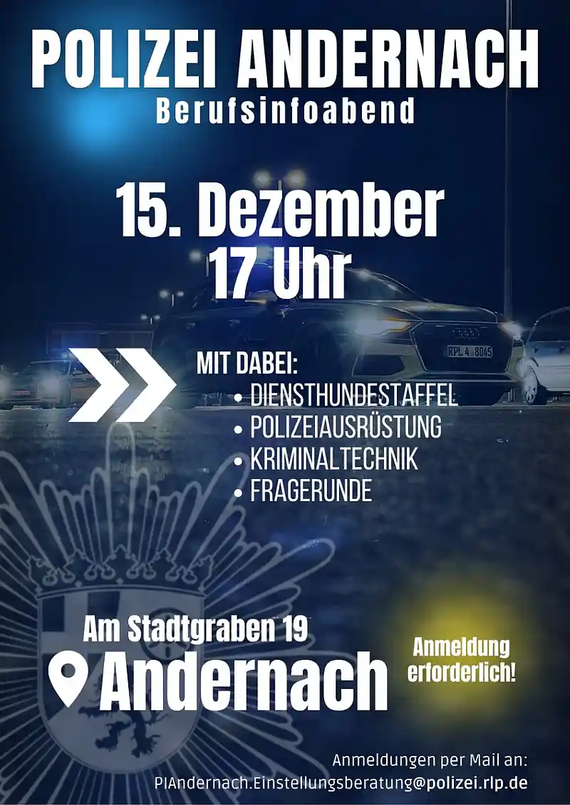 Interessierte sind herzlich eingeladen, sich für den Berufsinfoabend bis zum 11.12.2025 per E-Mail an PiAndernach.Einstellungsberatung@polizei.rlp.de anzumelden.